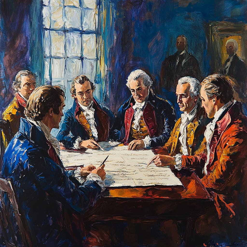 The signing of the Declaration of Independence, vibrant brushstrokes, colonial attire, quill pens, parchment, dramatic lighting, inspired by John Trumbull's painting style --v 6.1